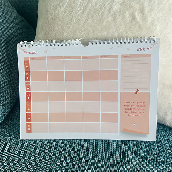 ‘Al jaren bestel ik de kalender en vindt het een fijne en mooie kalender. Veel plek om notities te maken. Elke week een mooie spreuk.’