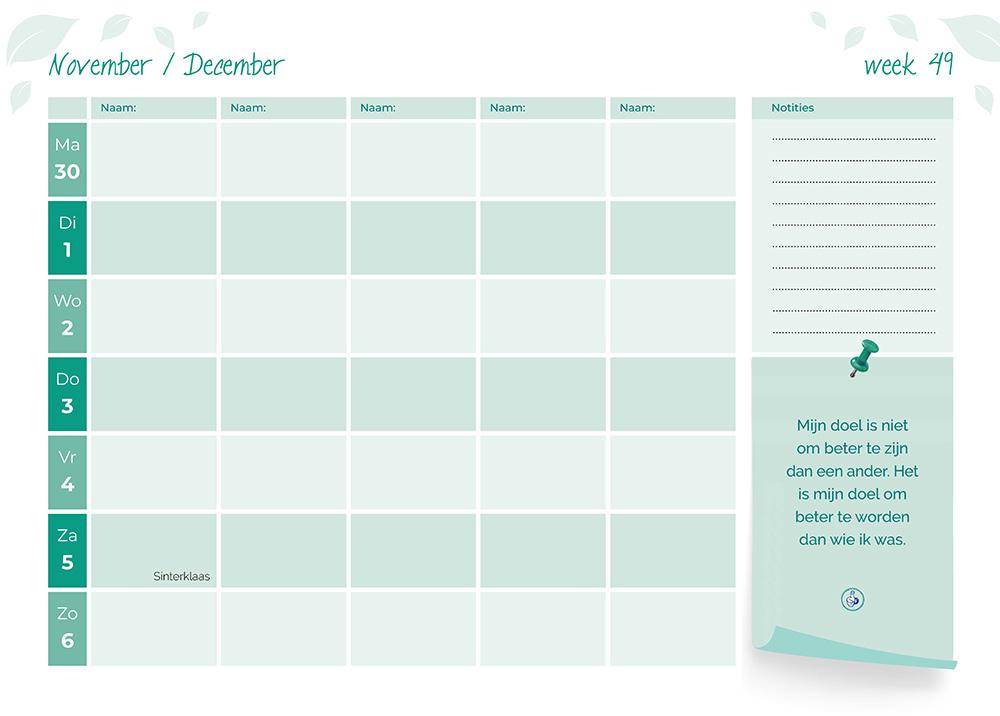 Deze positieve weekplanner heeft plek voor 5 gezinsleden. Met wekelijks een prachtige positieve spreuk, ruimte voor extra notities en kleurrijke stickervellen. En met een indeling, waarbij iedere volgende week op een volgend vel staat. Hierdoor is de familieplanner handig in het gebruik. Zo wordt samen plannen nog leuker.