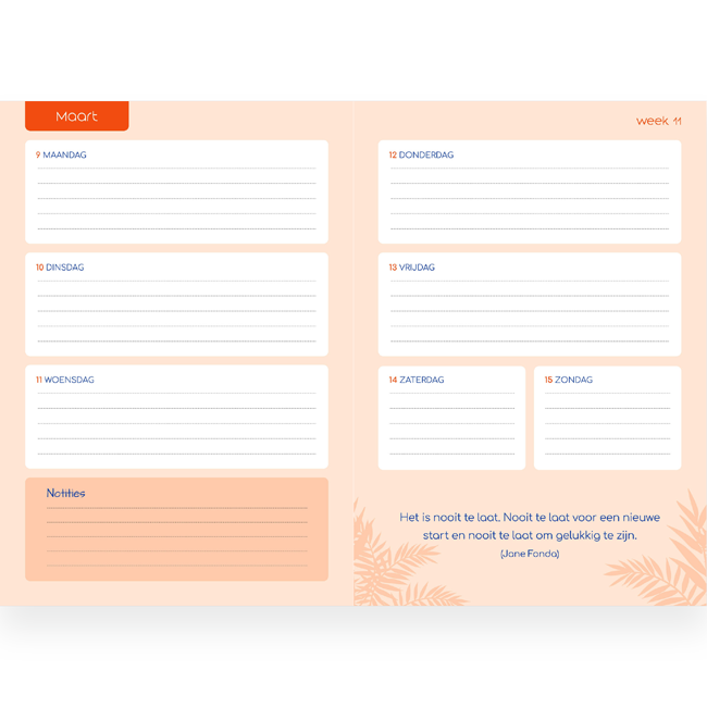 Elke week bevat een stralende boodschap, een positieve spreuk die je aanmoedigt om elke dag met optimisme tegemoet te treden. Deze inspirerende citaten dienen als inspiratie en helpen je om bewust te blijven van je eigen kracht en mogelijkheden.