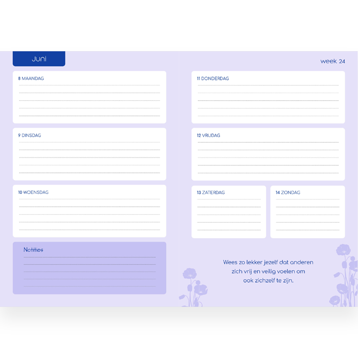 De agenda 2026 geeft het hele jaar heerlijke energie. Hij is mooi opgemaakt met wekelijks een prachtige positieve spreuk en tussendoor mooie verhalen. Het weekoverzicht is duidelijk, met veel ruimte voor afspraken en extra notities. In een handig A5 formaat zodat je hem eenvoudig kunt meenemen naar je afspraken.