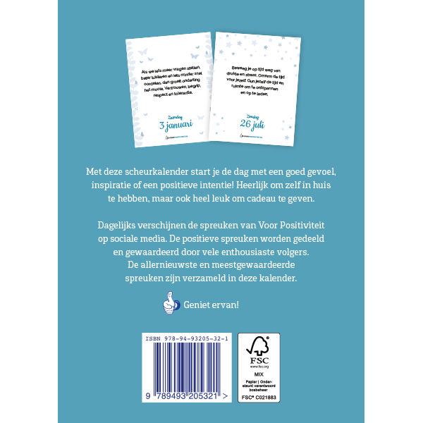 De scheurkalender 2026 van Voor Positiviteit met prachtige positieve spreuken geeft elke dag inspiratie, iets om over na te denken of een positief gevoel! De allernieuwste en meest gewaardeerde positieve spreuken zijn verzameld in deze kalender. Heerlijk om zelf in huis te hebben, maar ook heel fijn om cadeau te geven.