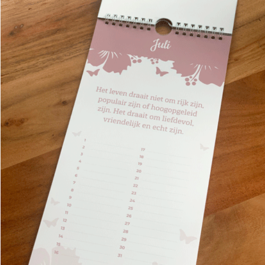 Heb je binnenkort een verjaardag? Een mooie dag om de ander te laten weten hoe bijzonder hij of zij voor je is. Met deze positieve verjaardagskalender vergeet je de verjaardagen van je familie en vrienden niet meer. En het is ook nog een toepasselijk cadeau voor de jarige, met prachtige spreuken.